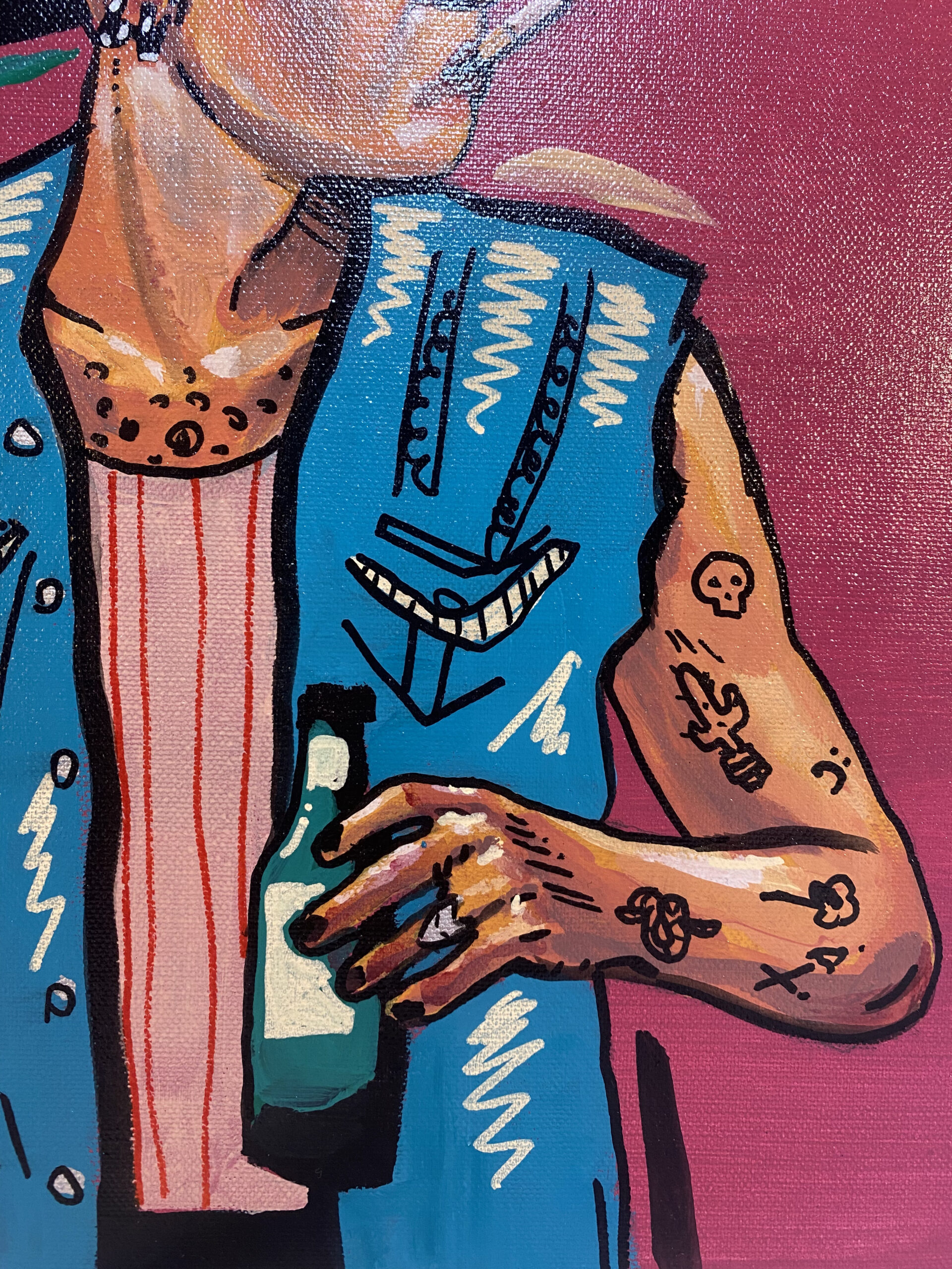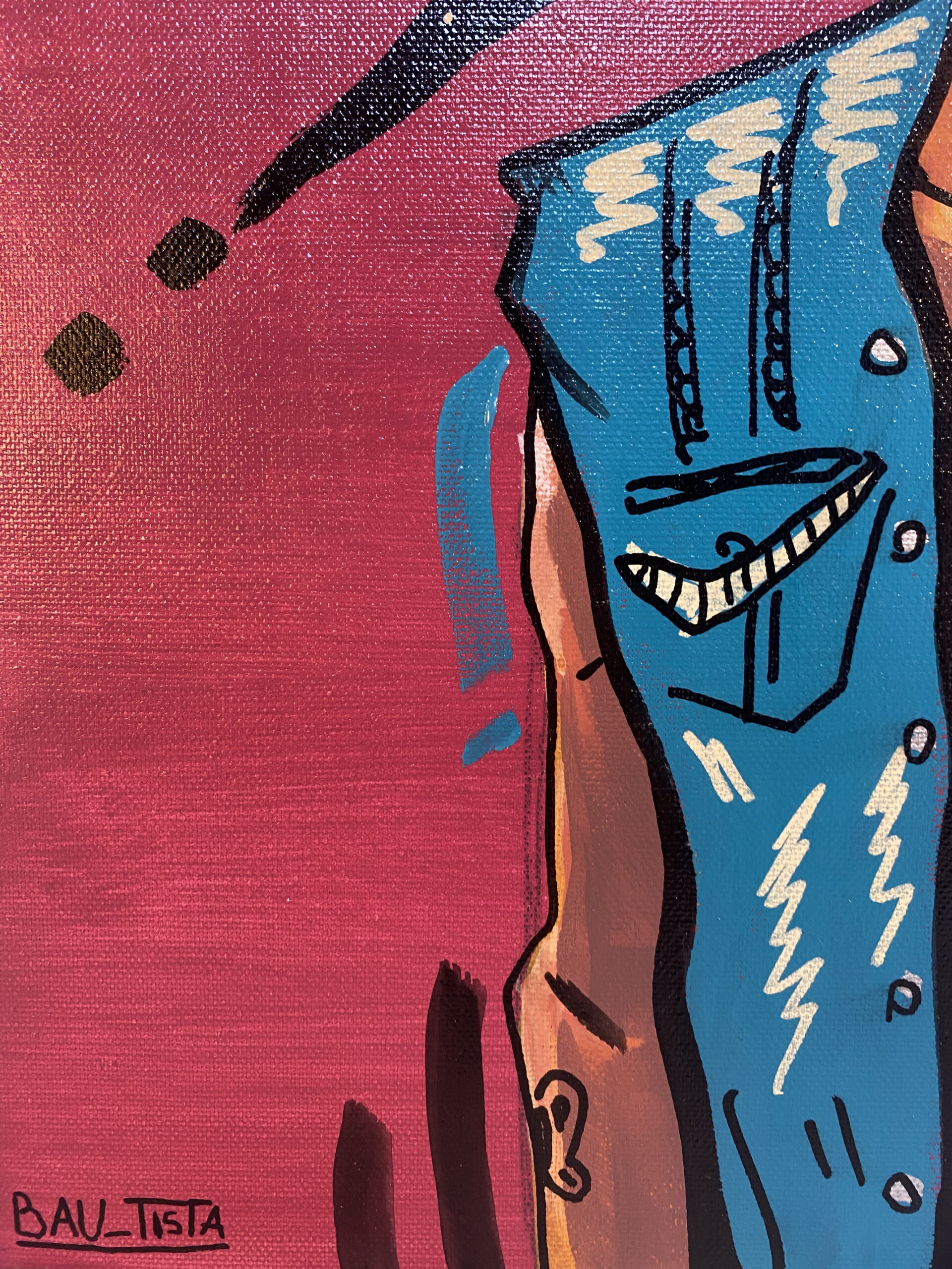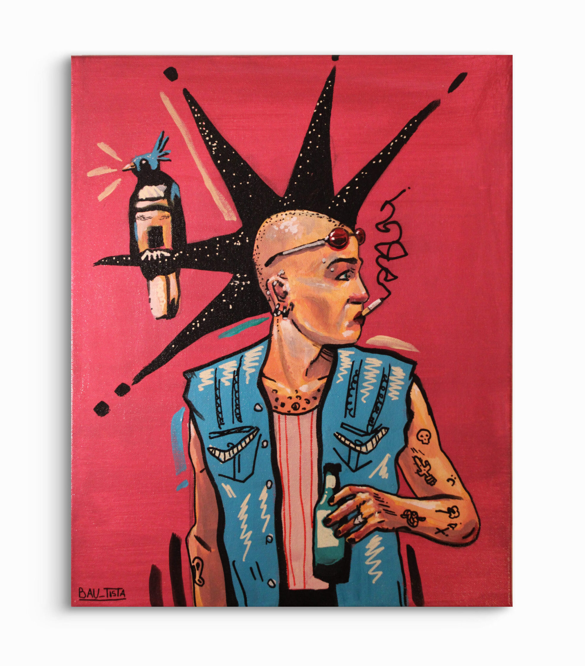 «R u Punk?!» retrata la identidad única y cambiante de un rockero de los años 90 y principios de los 2000. La obra trasciende lo meramente físico para adentrarse en el estado emocional de un personaje que encarna la rebeldía y el deseo de expresión. Sobre un fondo rojo vino —que evoca la intensidad del mundo del rock—, emerge una figura de cabellos en punta, coronada por un pájaro que simboliza la presencia, el orgullo y la necesidad de mostrarse al mundo tal como es, incluso cuando esa exposición roza la provocación.